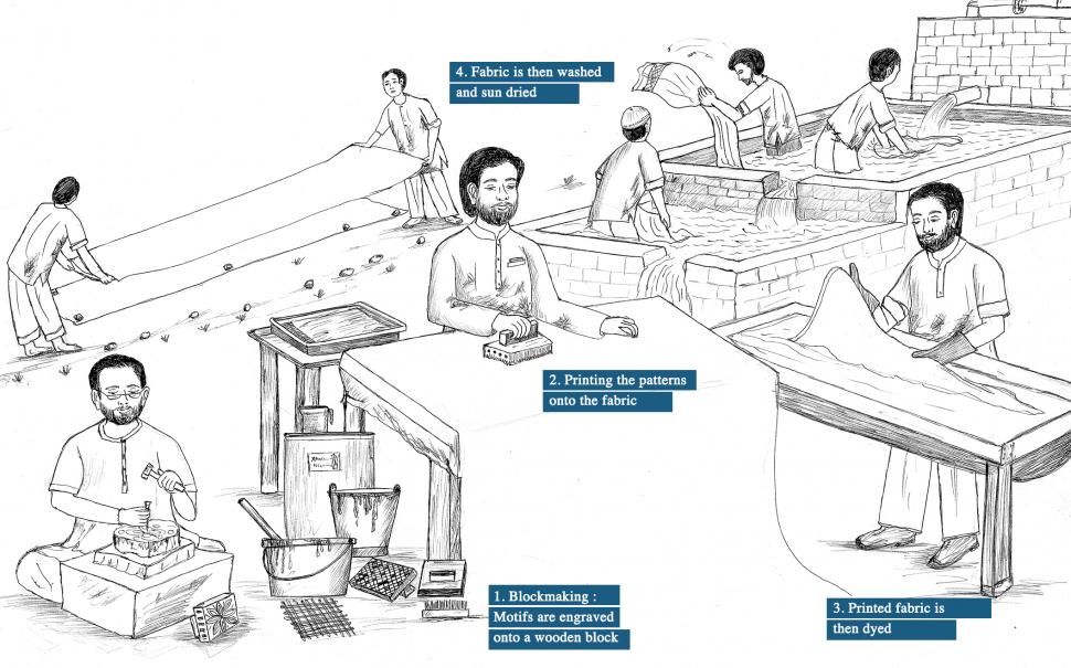 Chemical dyes are a major source of pollution in block printing villages. Various toxic dyes and chemicals are disposed of in village fields without any form of treatment. These chemical dyes are cheap and affordable, easily made in bulk. Today, few printers use vegetable dyes. Natural resources once used to create natural colors are no longer accessible locally because of the ecological effects of the 1956 and 2001 earthquakes and the loss of ecology cover from recent industrialization.