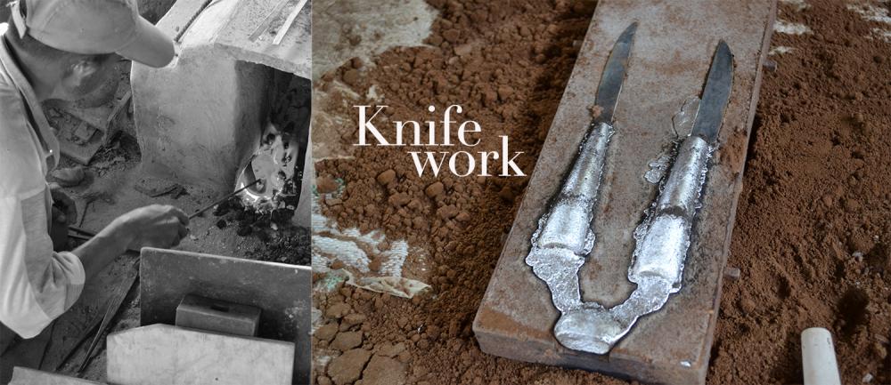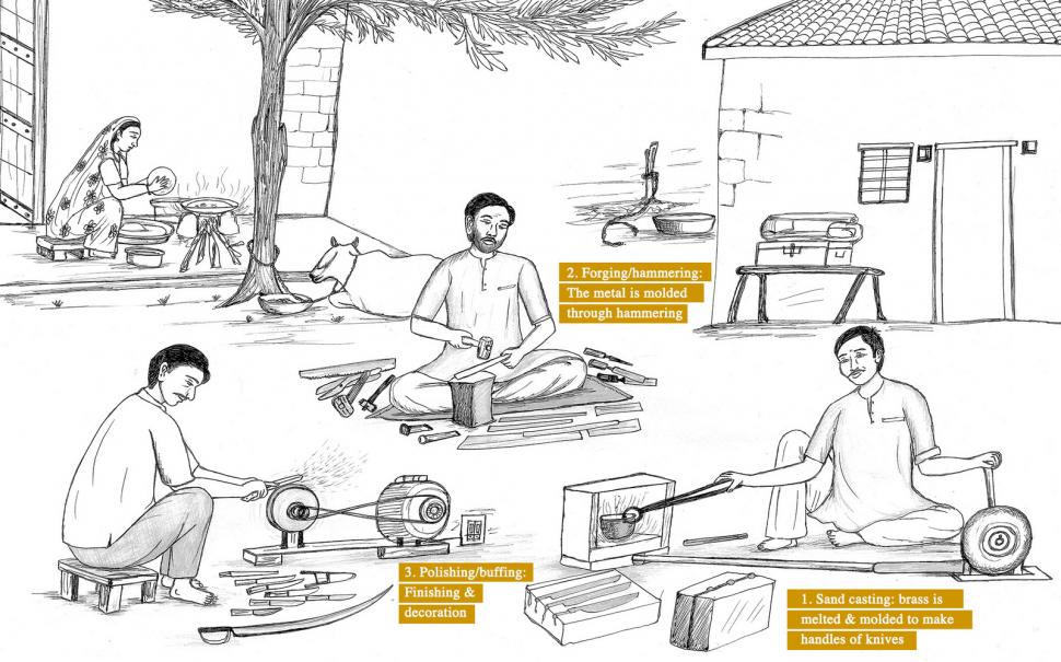 Six generations of metal knife makers have sustained this Kachchh craft in Nani Reha and Mota Reha villages. There are two types of knife-making tradition in Kachchh. The chari has a steel or iron blade known as a fur and a handle made from wood, plastic, or brass. The chappu is composed of the same parts with an added spring that allows it to fold. Some artisans specialize in crafting the blade, some in casting the handles, and others in polishing the final product. In this system, each knife is the result of many artisans’ collaborative work. A collaborative spirit strengthens the sector and together artisans meet the needs of a consistent demand.